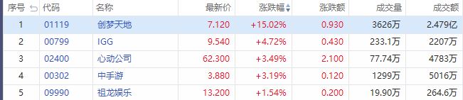 IGG上涨4.72%;心动公司上涨3.49%;中手游上涨3.19%;祖龙娱乐上涨1.54%。