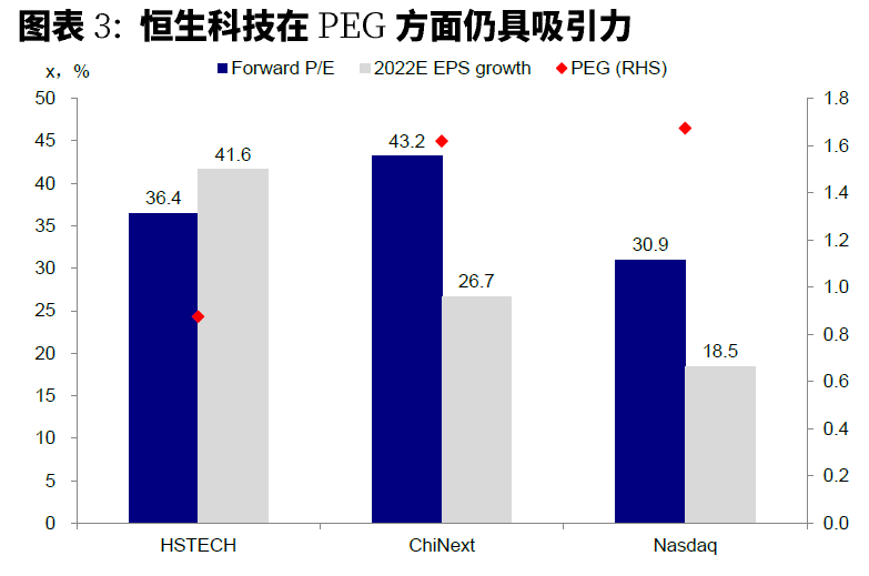 另一方面,海外中资股成长标的、尤其是平台经济仍将面临监管压力。上周证监会和网信办宣布将加大对海外上市中资企业的监管力度使得海外中资股科技和成长板块龙头受到冲击,这一点从上周一南向资金的大幅流出也可以得到体现,当日流出规模超过100亿港元,是三月初以来最大单日净流出。虽然监管政策仍是海外中资股面临的最大不确定性,但从长期角度来看成长标的依然具有吸引力。近期回调后恒生科技指数当前PEG为0.88,与A股创业板指数和纳斯达克市场的1.62和1.67倍相比有一定的吸引力。不仅如此,对中国企业海外上市的监管力度增加提升香港市场的吸引力。上周,港交所宣布IPO结算周期将从5天缩短至两天。我们认为此举有望进一步提升香港相对纳斯达克的竞争力。