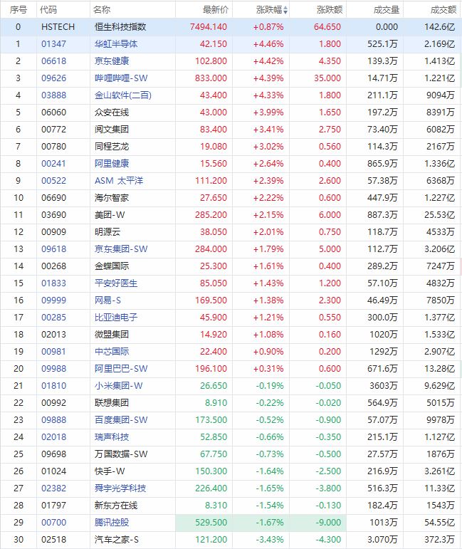 华虹半导体上涨4.46%;京东健康上涨4.42%;哔哩哔哩-SW上涨4.39%;金山软件上涨4.33%;众安在线、阅文集团、同程艺龙涨超3%;阿里健康、ASM太平洋;海尔智家、美团-W、明源云涨超2%。