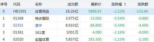 港股体育用品板块多数走低,特步国际、李宁跌5%,361度跌2%,安踏体育跌超1%,