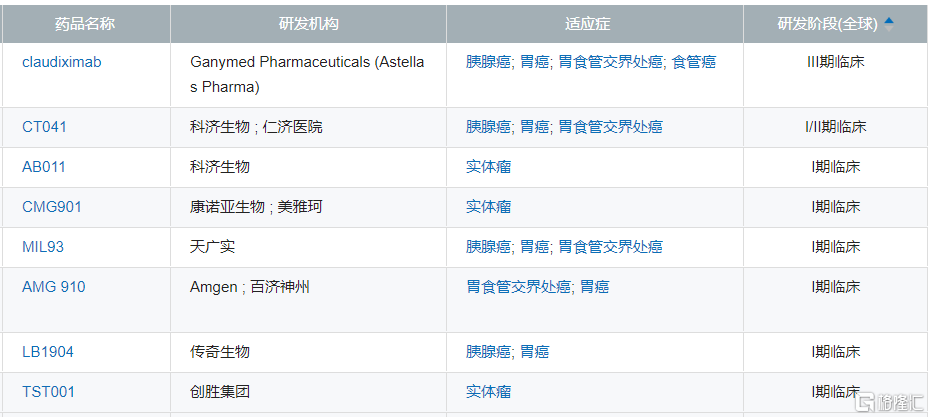 研发阶段领先的Claudin 18.2项目