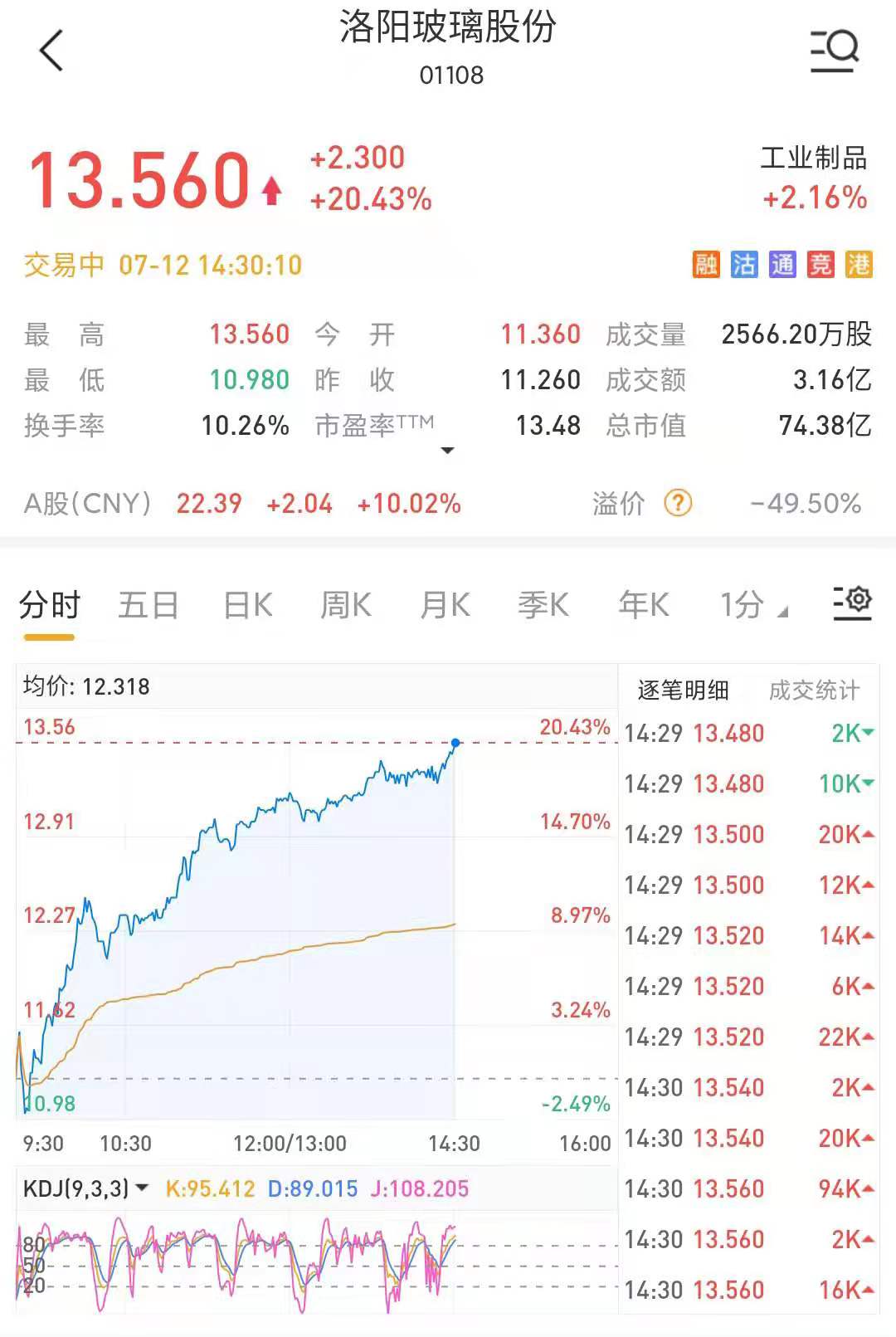 截至发稿,洛阳玻璃涨20.43%,报13.56港元/股,总市值达74.38亿,换手率为10.26%。