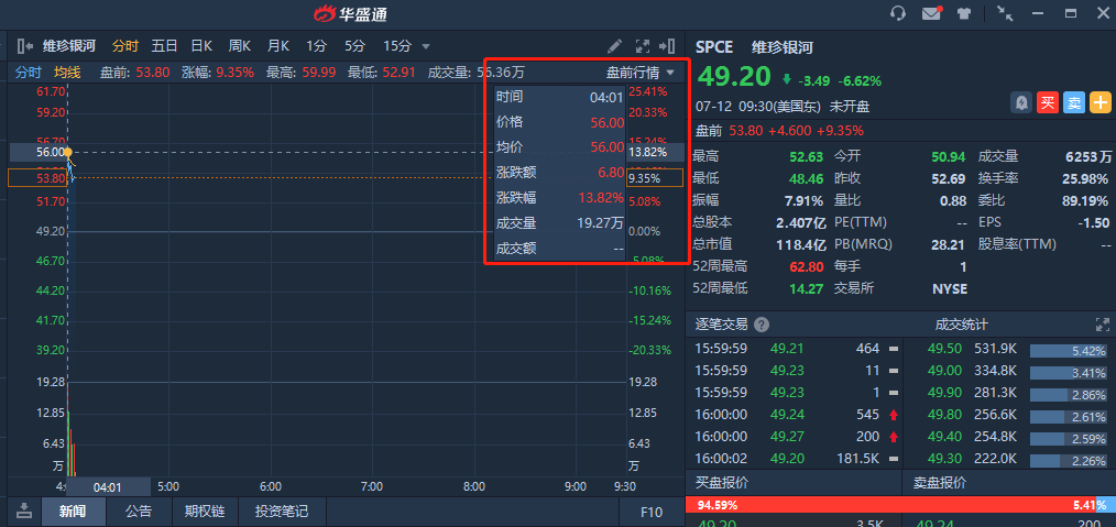 华盛资讯7月12日讯,美股盘前,维珍银河(SPCE.N)盘前一度涨近14%,公司“团结”号太空船11日完成首次满员太空试飞。