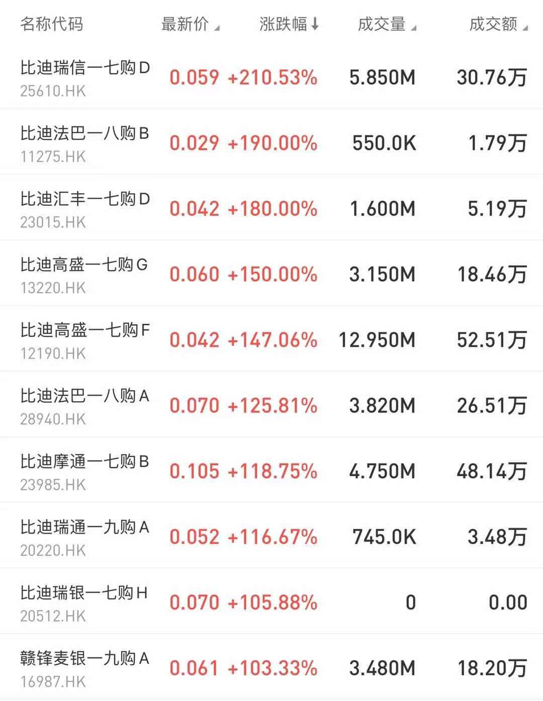 涨幅居前的包括:比迪瑞信—七购D暴涨210.53%,占据排行榜第一;比迪法巴—八购B涨190%;比迪汇丰—七购D涨180%。