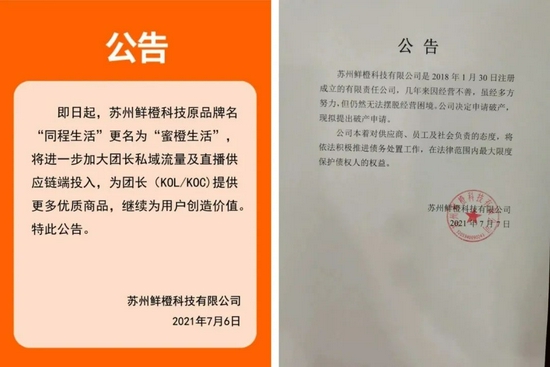 7月6日,同程生活更名为蜜橙生活,宣布放弃整个社区团购业务,业务方向从to C调整为to B;戏剧性的是,在次日,同程生活旋即发布破产清算公告。
