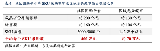 根据东吴证券的调研,社区团购平台上每日SKU不足1000个,考虑轮换后平台经营的SKU也仅约3000-5000个,而一般连锁超市的SKU在1-2万个左右,大卖场SKU可高达2万个以上。