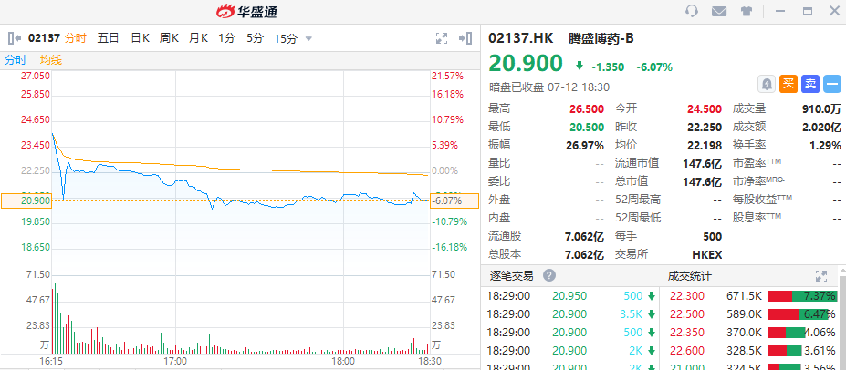 华盛资讯7月12日讯,生物制药企业-腾盛博药(02137.HK)暗盘收跌6.07%,一手账面亏损670港币,成交额2.02亿港币,最新总市值147亿港币;