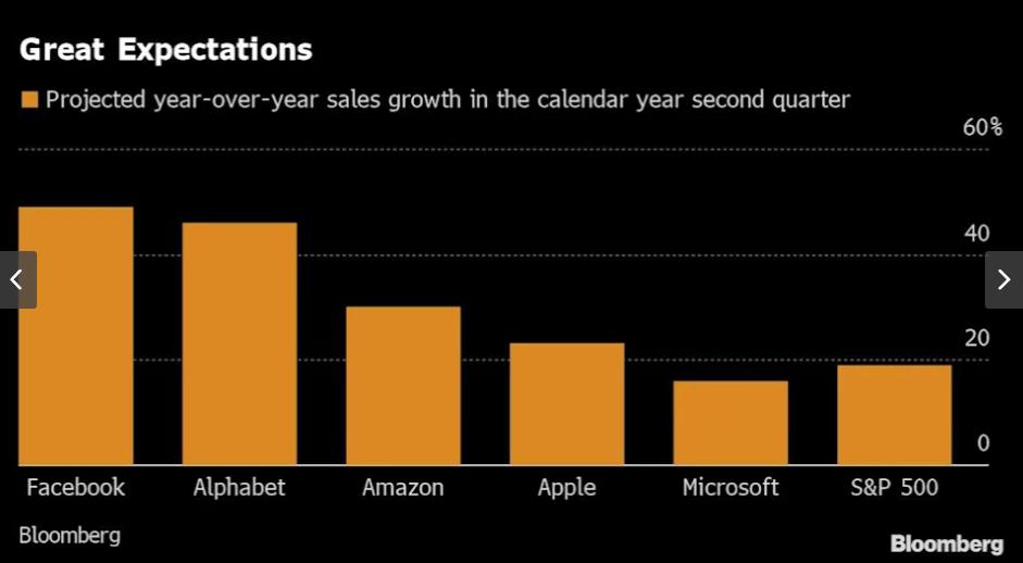 即将发布的第二季度财报可能会增加投资者的乐观情绪。根据彭博汇编的数据,预计faang收入都将实现两位数的增长,其中亚马逊预计增长 30%,谷歌和脸书预计增长 50%。标准普尔 500 指数成分股的整体收入预计将增长 19%。