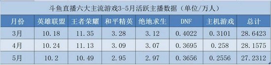 据行业人士透露,今年3月份至今,斗鱼六大主流游戏板块活跃主播数量,从28.64万下降至27.23万,活跃主播减少了1.41万。