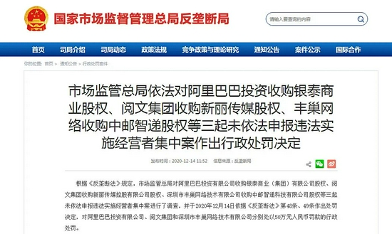 从去年12月开始,市监总局开始审查互联网领域经营者集中案件,共公布44个未申报的经营者集中案件,多起为腾讯主导,例如阅文收购新丽传媒、腾讯收购易车股权等,均处以50万元罚款。