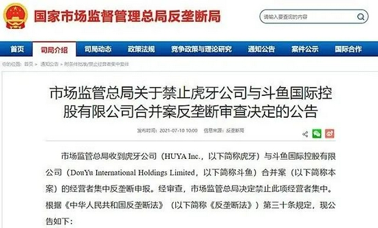7月10日,市场监管总局宣布,对腾讯控申报的虎牙与斗鱼合并案,依法进行经营者集中反垄断审查后,不予批准二者合并。