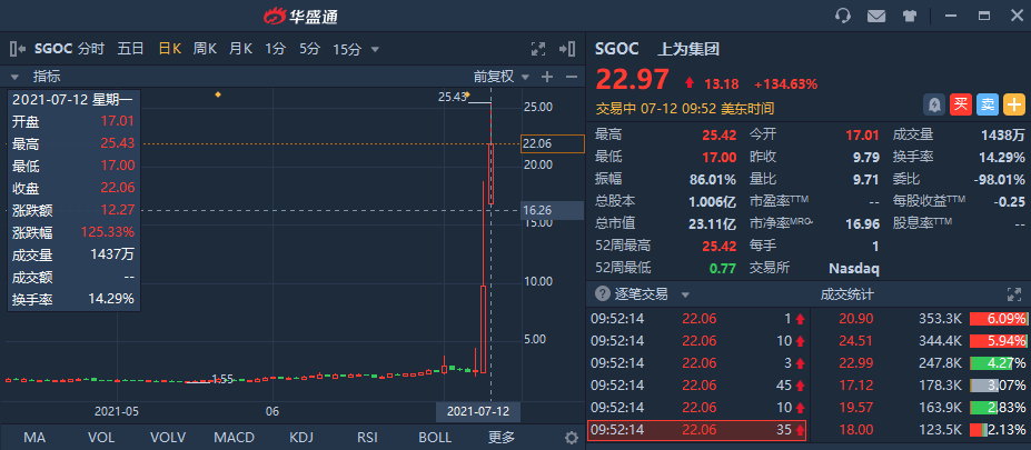 华盛资讯7月12日讯,美股早盘,中概股涨跌不一。截至发稿,上为集团一度大涨超134%,此前收盘涨近279.46%。