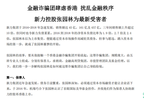 根据求救信内容所写,2016年,张园林机缘巧合下认识了农银国际及华泰金控作,并找他们作为保荐人协助新力控股香港上市。