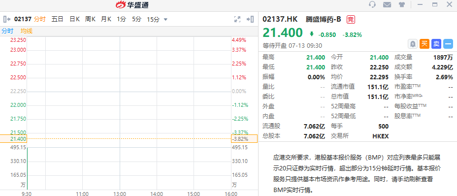 华盛资讯7月13日讯,生物制药企业-腾盛博药(02137.HK)首挂低开3.82%,当前成交额4.229亿港元,最新总市值超151亿港币。