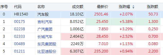 港股汽车股继续上涨,吉利汽车涨5%,广汽涨超3%,长城涨超2%,比亚迪、小鹏等走高。