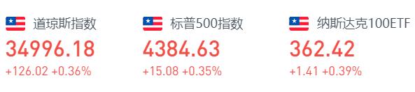 截至收盘,道琼斯指数涨126.02点,涨幅0.36%,报34996.18点;标普500指数涨15.08点,涨幅0.35%,报4384.63点;纳斯达克综合指数涨31.32点,涨幅0.21%,报14733.24点。