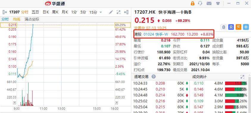 相关涡轮方面,快手海通一十购B涨近70%,其行使价为188.98港元,到期日为2021年10月8日,溢价22.76%。
