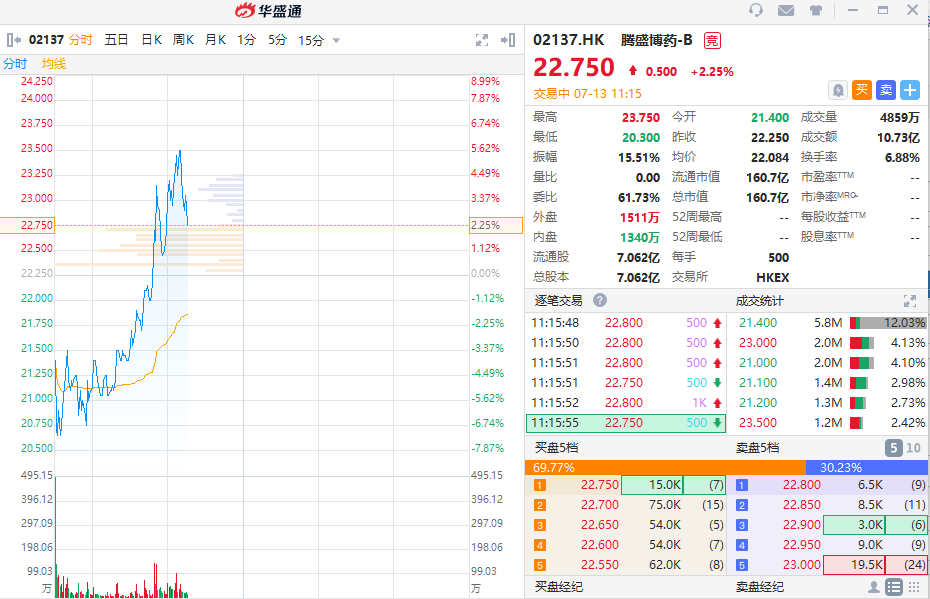 华盛资讯7月13日消息,腾盛博药今日首挂,低开高走,盘中持续拉升,现已由跌转涨,站上发行价之上。截至发稿,腾盛博药涨2.25%,现报22.75港元每股,暂成交10.73亿港元,最新总市值160.7亿港元。