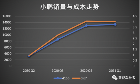 去年一季度小鹏的销售成本是0.67亿美元,到今年一季度上升到4亿美元。