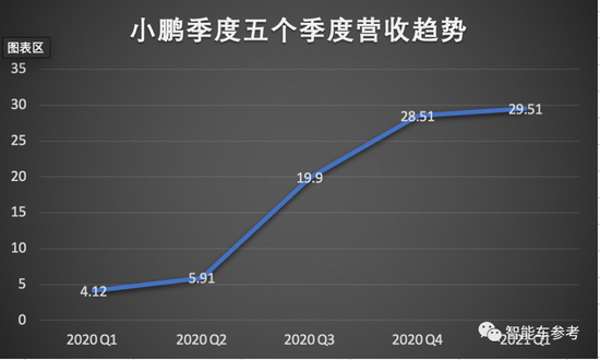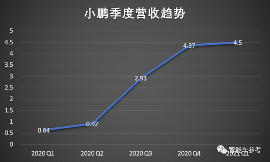 2020年一季度小鹏营收0.64亿美元,到2021年一季度达4.5亿美元。