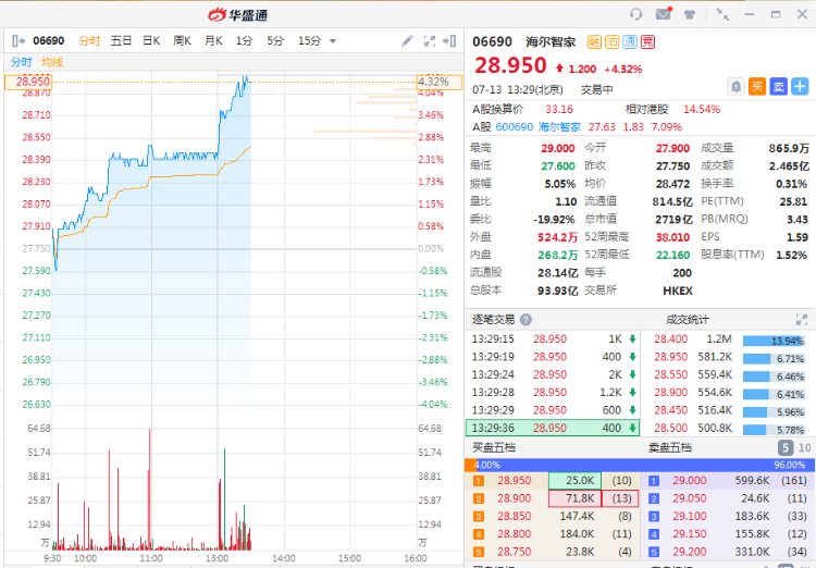 海尔智家(06690.HK)午后拉升4%,A股海尔智家涨7%。据港交所权益披露资料显示,海尔智家近日获母公司海尔集团增持127.26万股A股,涉资约人民币3191.76万元。增持后,Haier Group Corporation最新持股数目为2,587,405,270股,持股比例由40.99%上升至41.01%。