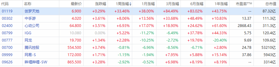 随着暑期的到来,学生们也将获得更多的休闲娱乐时间,游戏的需求量和付费率可能明显提升。而最近一周,手游版块相关标的也出现明显异动。如创梦天地(01119)近一周大涨已超30%,中手游(00302)、心动公司(02400)、IGG(00799)等,都有不错的表现。