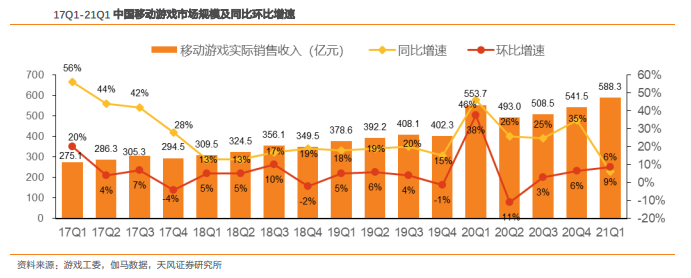 空调WIFI西瓜,再加上游戏,或许是炎热暑期最舒服的放松模式之一了。而具有方便快捷等优势的手机游戏市场,在我国发展十分迅猛。2021年Q1,我国移动游戏市场实际销售收入达到588.3亿元,环比增8.64%,同比增长6.25%,甚至超过了疫情冲击的2020年Q1表现。截至2020年,我国移动游戏用户规模已高达6.5亿人。