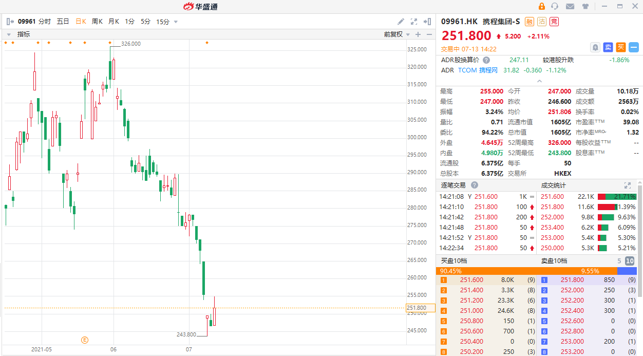 近期携程股价随大市下跌后有企稳迹象,截至发稿报251.8港元,距离天风证券最高目标价仍有超过30%上涨空间,投资机会凸显。