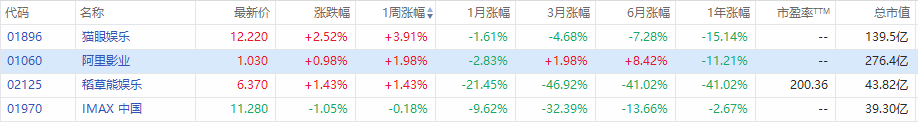 截至发稿,阿里影业报1.03港元,猫眼娱乐报12.2港元,意味着距离券商的目标价仍有较大的上涨空间。