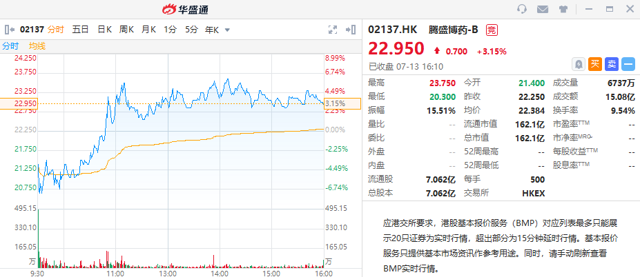 华盛资讯7月13日讯,生物制药企业-腾盛博药(02137.HK)盘中拉升,首挂收涨3.15%,一手账面浮盈350港币,全日成交额达15.08亿港元,最新总市值超162亿港元。