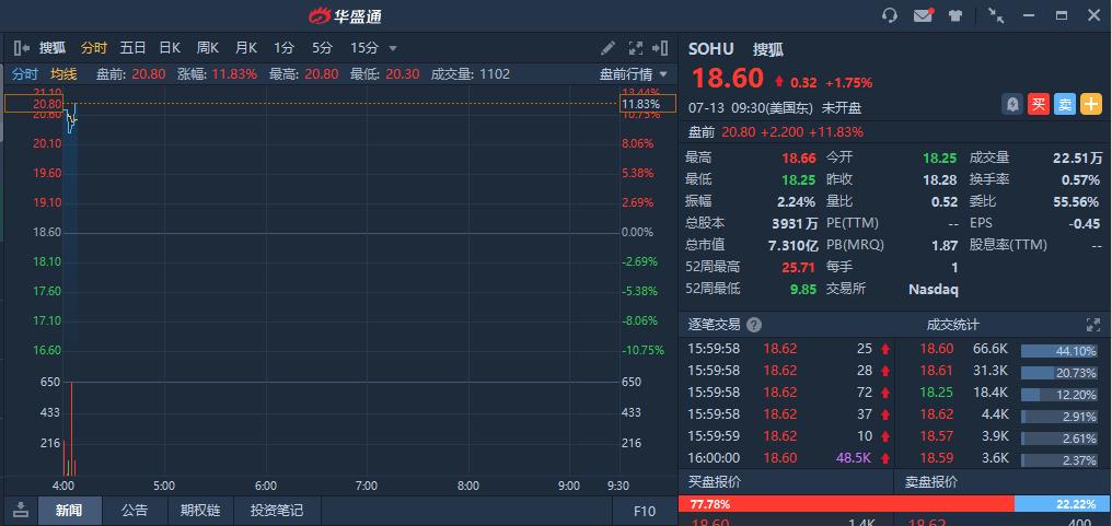 华盛资讯7月13日消息,美股盘前,搜狐(SOGO.N)大涨12%,市场监管总局无条件批准腾讯收购搜狗公司股权。