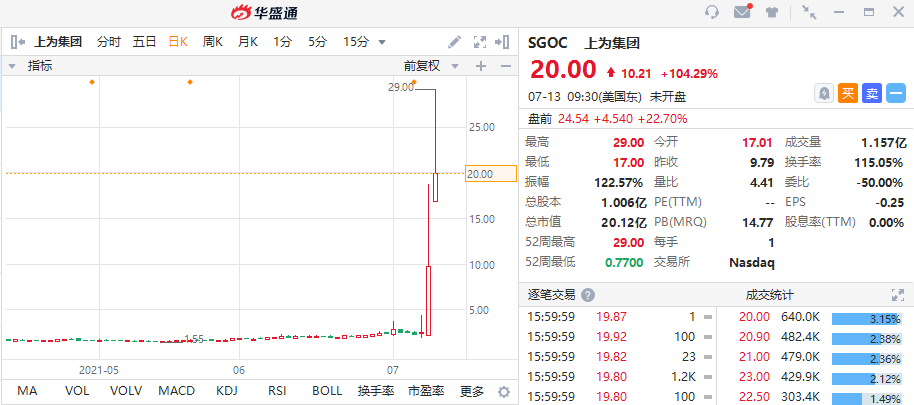 在过去的几天里,散户一直在关注中概股上为集团(SGOC),SGOC的股票近日不断走高,在短短一周内累计上涨了超过660%。截至发稿,该股周二盘前续涨超22%。尽管公司没有发生任何可以被视为催化剂的重大事件,但较低的市场知名度,以及较低的流通股量,似乎成为目前散户交易员选股的新标准。