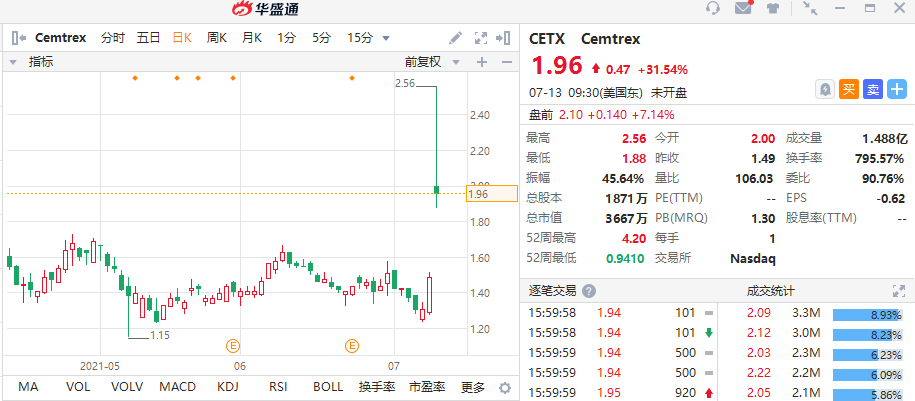 尽管Cemtrex仍是一只低价股,但它的股价似乎与较小的股权结构相符。CETX只有不到2000万流通股本,更重要的是,日均交易量通常在100万股以下。值得注意的是,CETX在周一的交易量超过9700万股,这似乎是上周涨势的延续。