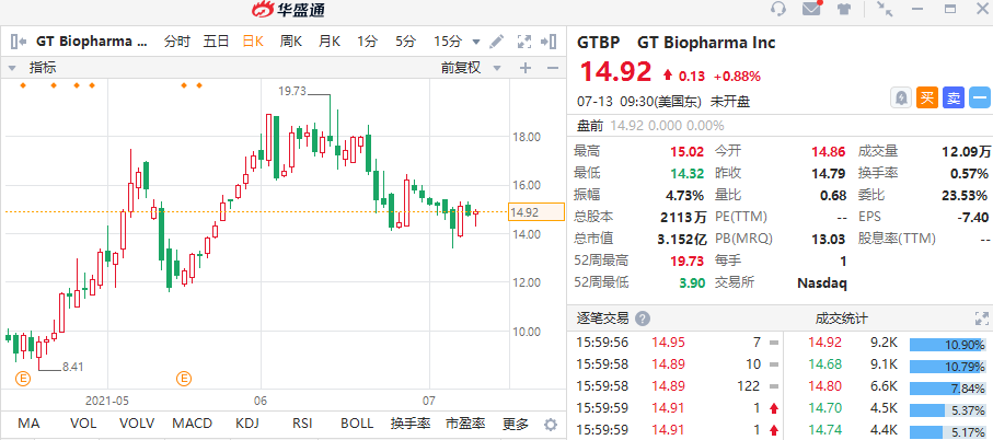 作为一家临床阶段免疫肿瘤学公司,GTBP专注于开发基于公司专有的天然杀手细胞Engager(TRIKE ™)蛋白质生物技术平台的创新疗法。其日均交易量不到100万股,流通股数量约为2100万股,公司股价在3月中旬时仅为4美元。除新冠疫苗外,今年市场的热点话题之一便是癌症治疗。在这家公司身上,其GTB-3550临床阶段试验的早期成功无疑吸引了散户和机构投资者的兴趣,该治疗方案是为急性髓系白血病和骨髓增生异常综合征的患者设计的。