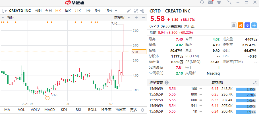 CRTD的日均成交量低于100万股,流通股更是不到1200万股。更重要的是,看一下这只股票和SGOC的成交量趋势,你可能会看到一些相似之处。在上周四(7月8日)之前,成交量很不活跃。当我们看到不寻常的成交量趋势开始的时候,这要归功于Reddit散户的关注。从那时起,像SGOC一样,CRTD股票的成交量一直远远高于平均水平。