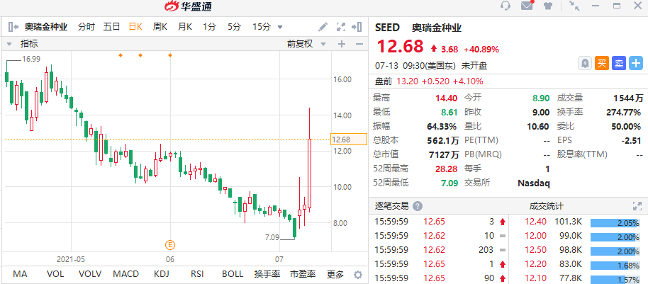 与其它默默无闻一夜暴涨的“前辈”不同,奥瑞金种业近日频频传来利好消息。7月8日,农业部宣布奥瑞金种业4个杂交玉米品种获得农业部批准。这一消息似乎点燃了最初的火花,开始了这波看涨的势头,在市场上为SEED股价推波助澜。