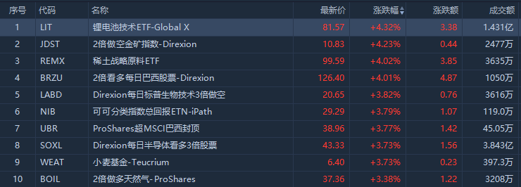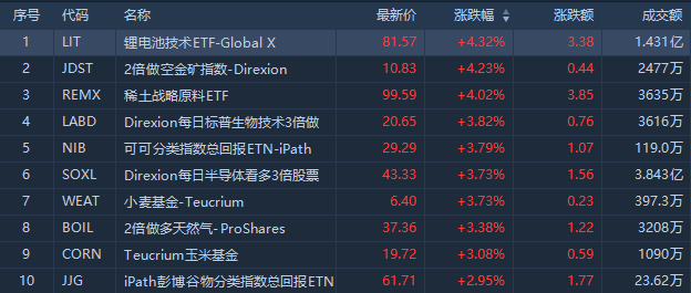 从行业ETF涨幅榜来看,涨幅居前的是锂电池技术ETF的LIT涨4.32%,成交额1.43亿美元。