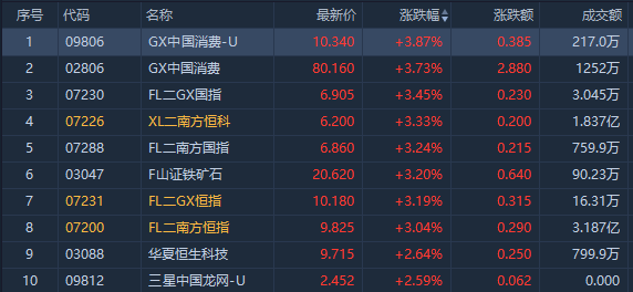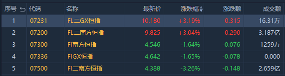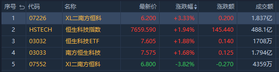 涨幅居前的是南方两倍看多恒指(07200.HK)涨3.04%,成交额3.19亿港元。