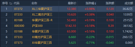 沪深300指数收涨1.25%。其中,华夏沪深三百-R(83188.HK)涨0.19%;华夏沪深三百ETF(03188.HK)涨0.16%,成交额1.74亿港元。