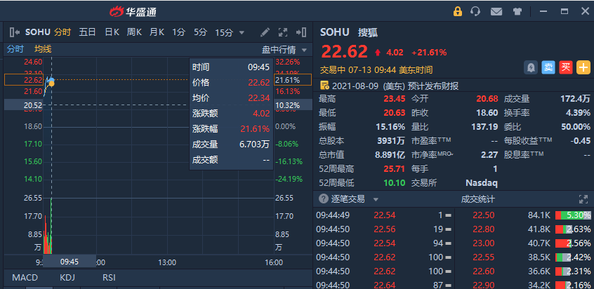 华盛资讯7月13日讯,美股早盘,中概股全面高开。截至发稿,搜狐一度大涨近22%。