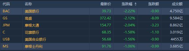 华盛资讯7月13日消息,美股银行股普跌,截止发稿,美国银行(BAC)、高盛(GS)、摩根大通(JPM)跌超2%,花旗银行(C)跌1.5%,大摩(MS)跌1%。