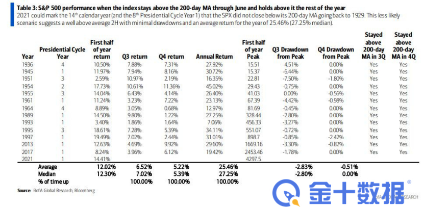 Suttmeier认为,如果标准普尔500指数在今年剩余时间里都保持在200日移动均线以上,那么2021年将是标准普尔500指数自1929年以来第14年全年保持200日移动均线以上。这种情景下年平均回报率为25.46%。