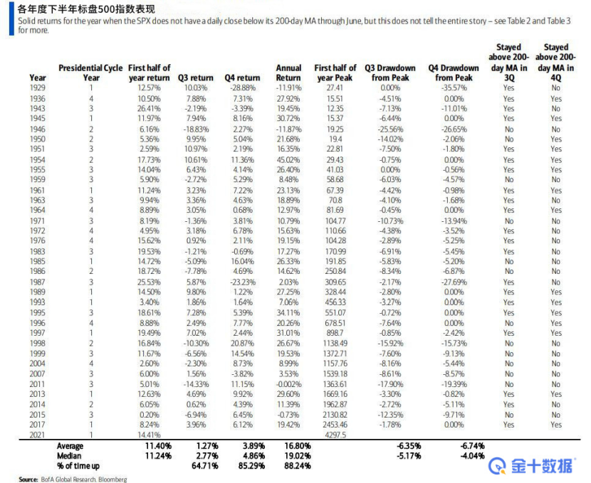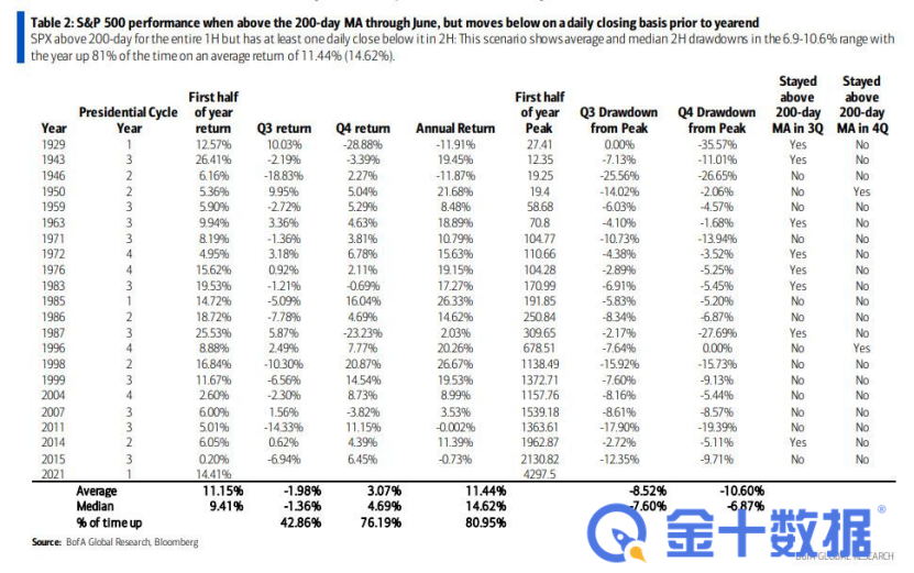 但美国银行首席市场技术分析师斯蒂芬•萨特迈尔(Stephen Suttmeier)表示,这一趋势可能在下半年面临危险。这是因为,在1929年至2021年的93年中,有35年(占总时间的38%)标普500指数在上半年持续高于200日移动均线。