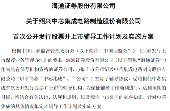 记者从证监会官网获悉,7月12日,绍兴中芯集成电路制造股份有限公司(下称“绍兴中芯”)已向浙江证监局递交辅导备案,计划在A股IPO,海通证券担任其首次公开发行股票并上市的辅导机构,上市板块暂未披露。