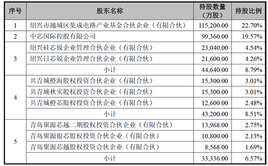 备案材料显示,截至目前,公司有数十位股东,其中第一大股东为绍兴市越城区集成电路产业基金合伙企业(有限合伙),持股比例为22.7%,第二大股东中芯国际控股有限公司(即中芯国际)持股比例为19.57%。