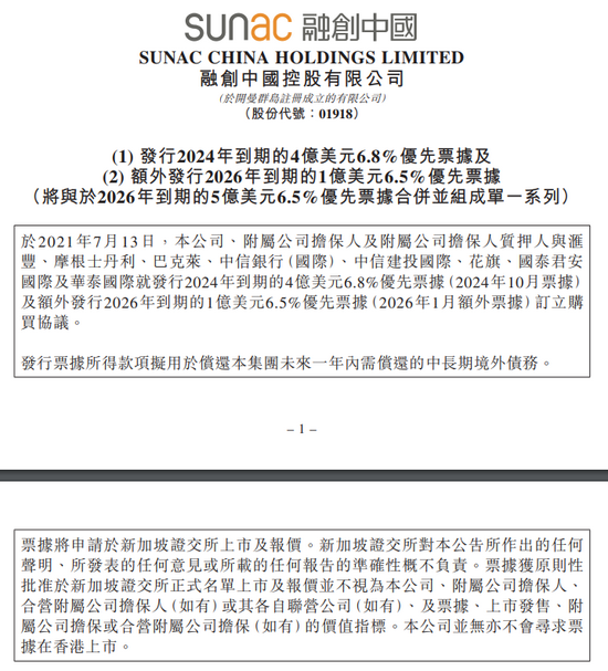 融创中国(01918.HK)发布公告,2021年7月13日,公司(作为发行人)、附属公司担保人及附属公司担保人质押人与汇丰、摩根士丹利、巴克莱、中信银行(国际)、中信建投国际、花旗、国泰君安国际及华泰国际就发行2024年到期的4亿美元6.8%优先票据(2024年10月票据)及额外发行2026年到期的1亿美元6.5%优先票据(2026年1月额外票据)订立购买协议。发行票据所得款项拟用于偿还集团未来一年内需偿还的中长期境外债务。票据将申请于新加坡证交所上市及报价。