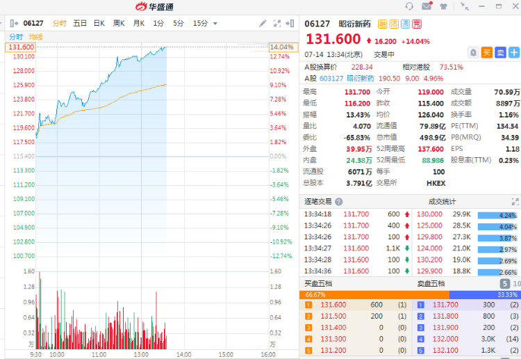 CRO龙头昭衍新药股价大涨不断,今日再度涨超14%,市值498亿港元。