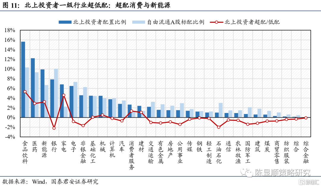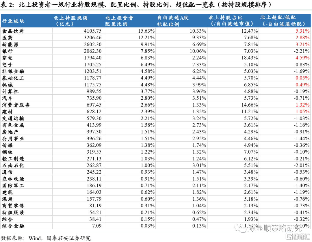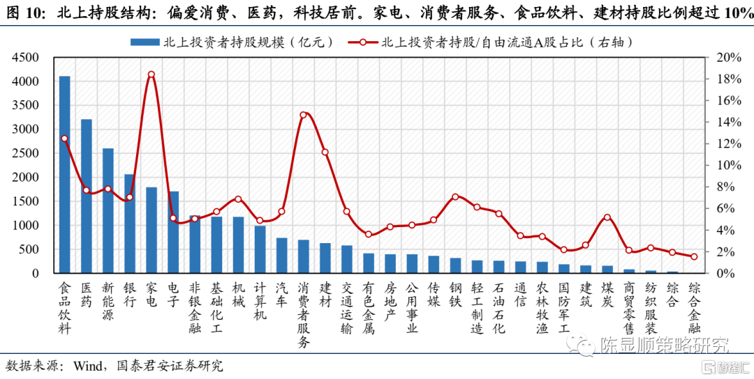 从北上投资者行业持股规模看:偏爱消费、医药,科技居前。在2.6万亿的北上投资者持仓当中,从一级行业的角度根据我们的估算,北上投资者持有前五的板块分别为食品饮料4105.75亿元(配置比例15.63%)、医药3206.46亿元(12.21%)、新能源2602.30亿元(9.91%)、银行2062.30亿元(7.85%)、家电1794.40亿元(6.83%),前五大行业持仓规模占比达到52.44%。表明北上投资者的持仓仍相当集中,从存量的角度看北上持仓的结构总体上偏好消费医药,科技当中的新能源、电子、计算机持仓规模也相对居前,其持仓存量结构的思路是比较清晰的,总体沿着中国经济转型升级的趋势与方向。如果从定价权(北上持股市值/自由流通市值)的角度我们可以看到,在家电、消费者服务、食品饮料、建材持股等领域北上持股比例已超过10%,多数行业位于5%左右。