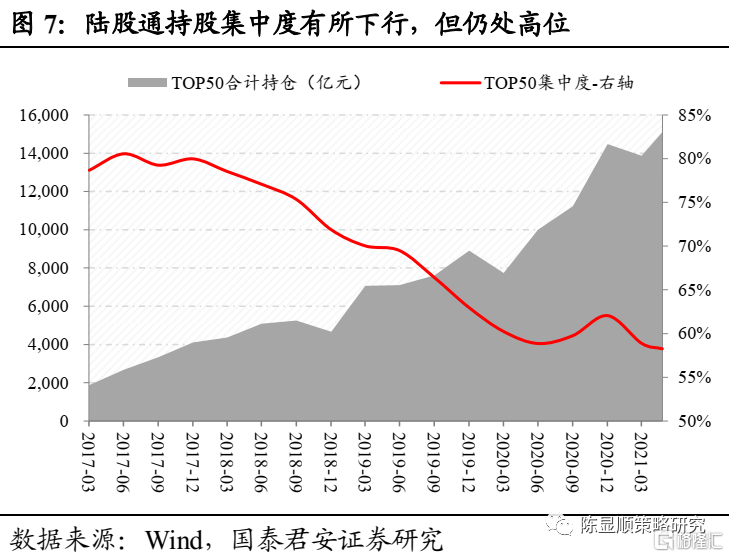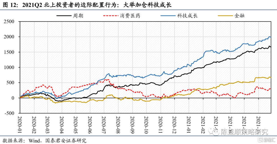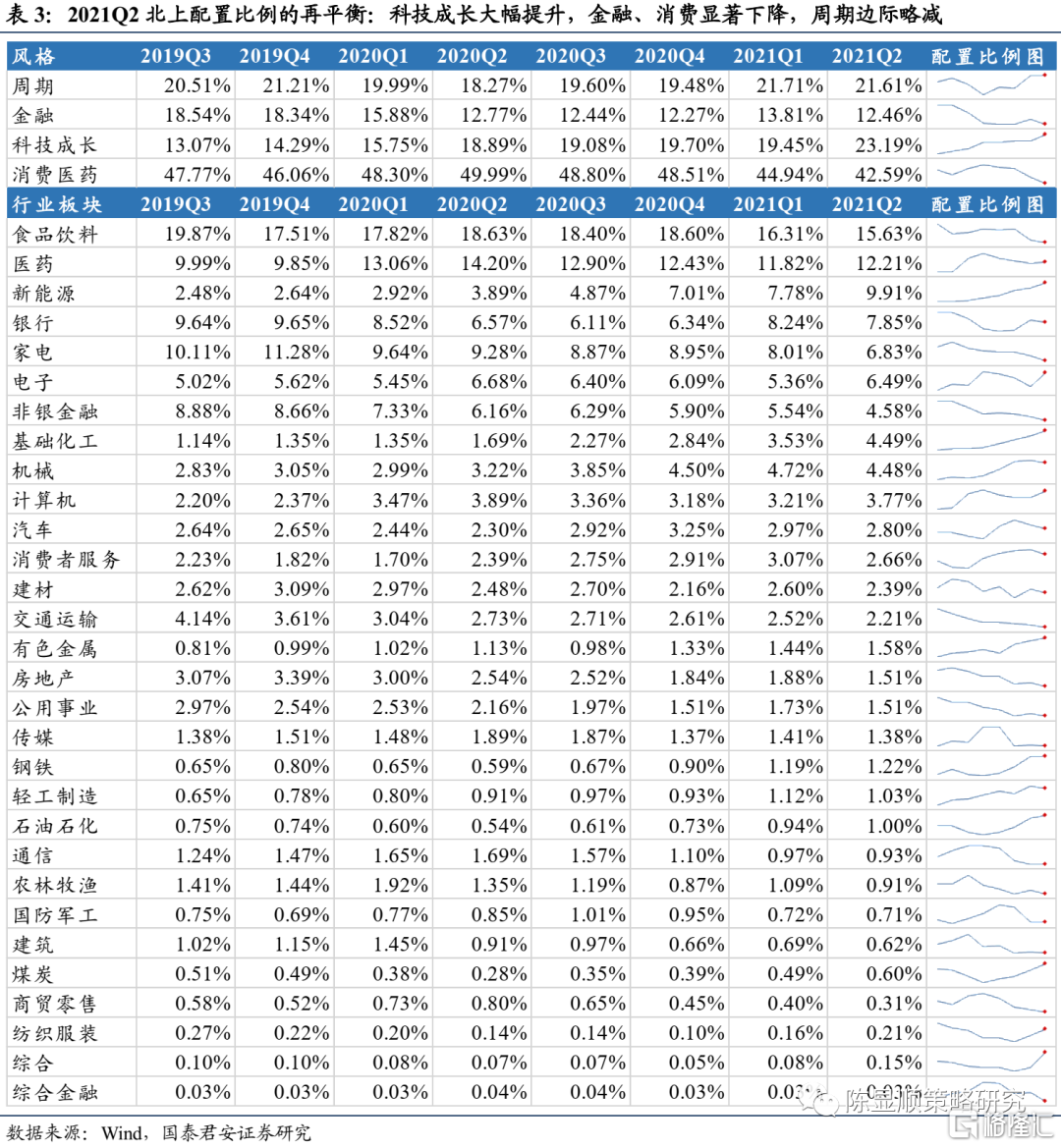 北上投资者持仓占比的再平衡:科技成长显著提升,金融、消费下降。从持仓占比的角度我们来观察北上投资者的配置行为,科技成长板块持仓占比从2021Q1的19.45%上升至Q2的23.19%,消费板块持仓占比从2021年Q1的44.94%下降至Q2的42.59%,金融从Q1的13.81%下降至Q2的12.46%,周期从Q1的21.71%小幅下降至Q2的21.61%。不同于边际配置行为的净买入差异,北上投资者Q2大幅增持周期但持仓规模并未出现明显上升,反而较Q1边际小幅下降,因此这为我们理解北上投资者在Q2大幅增持周期提供了一个新的视角,即北上投资者存在再平衡持仓占比的可能。