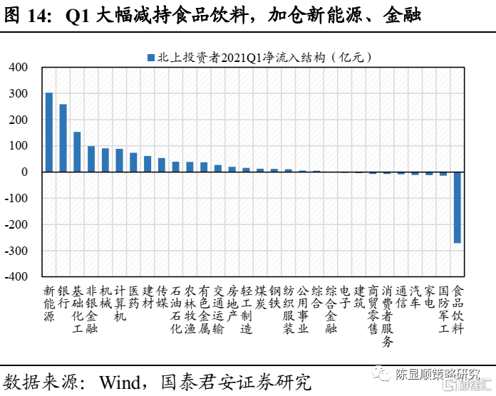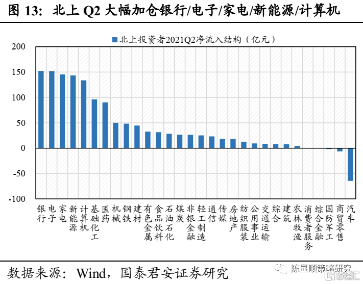 从边际配置的角度看:北上资金Q2加仓科技成长与周期。如果我们把北上资金当成一个整体(忽略各不同类型的北上投资者差异),在这个过程当中我们看到北上投资者的边际配置行为出现了一个较为明显的切换,其中2021年Q2北上投资者净买入科技板块468.24亿元,净买入周期395.17亿元,净买入消费214.11亿元,净买入金融177.98亿元。具体来看,Q2净买入前五的行业为银行、电子、家电、新能源和计算机;净卖出主要行业为汽车、商贸零售、国防军工、综合金融。与Q1的净买入结构相比,我们可以看到新能源、银行、基础化工等保持较高的净流入规模。